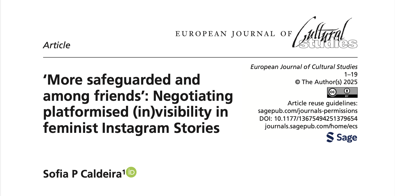 The article ‘More safeguarded and among friends’: Negotiating platformised (in)visibility in feminist Instagram Stories authored by Sofia P. Caldeira, has been published in the European Journal of Cultural Studies.